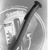 第二种为吉他保持湿度的方法则是在吉他盒内加湿(当然,我们假设您在弹奏之外,总是将吉他保存在盒中)。这种方法影响较小,因为您的房间环境丝毫不受影响。不过,如果您不经常检查您的吉他,您可能无法意识到琴盒内湿度条件的改变。如果您通常将吉他保存在琴盒中,并能够定期检查内部湿度,这种加湿方法则是非常优秀的选择。您可以使用塑料的胶片罐或肥皂碟加一块海绵来自制加湿器。不过,这类自制系统通常并不可靠,而且需要细心监测并保持足够的水分。另外一种经常使用的产品叫做Dampit(左图),是由同名公司生产;这是一个相对非常经济的解决方案。(GS注:Dampit主要由两部分组成,一部分是一块同吉他音孔完全吻合的塑料盖,塑料盖内部有一条测量湿度的试纸,红端为低湿度,蓝端为高湿度,红蓝交界处为当时的环境湿度。