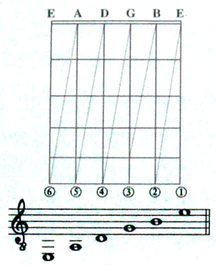 通常高音弦以①②③弦顺序依次结弦,低音弦以⑥⑤④顺序依次结弦。结弦时先将弦的一端结在琴码上打个结绕两圈用力拉紧,然后将另一端结在弦轴上打个结。注意更换弦时应当逐弦更换,待所换的新弦调准后,再更换下一根弦,依次类推。