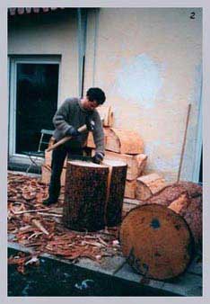 | 以木楔撬开裂缝后,史丹策尔以手将两半木头完全掰开。 |