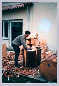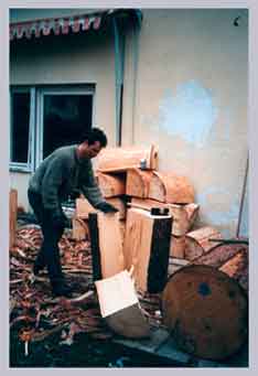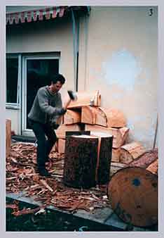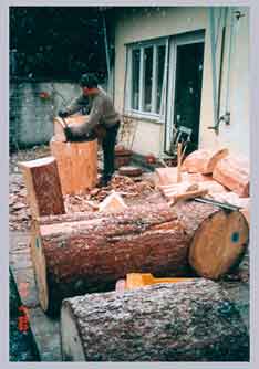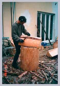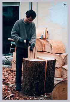 在以钢制刀具切割出最初的入口后,制作家以木楔在两半木头间撬出裂口。 |